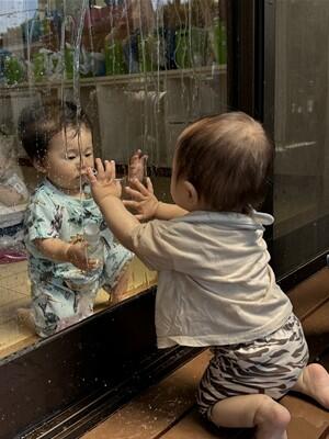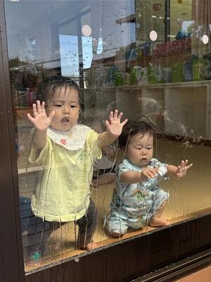 保育者がテラスから窓ガラスに向けて水をかけると、初めはびっくりした表情でしたが、