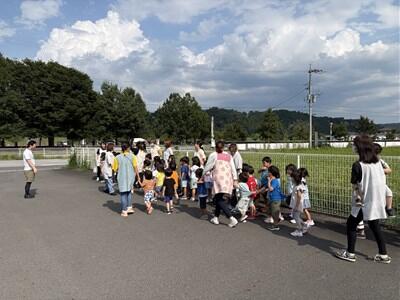 各クラス園庭に避難し、人数の確認後、煙が流れてきたことを想定して2次避難です。
