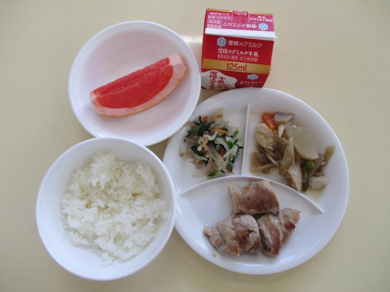 ・ごはん ・豚肉のアップルソース ・お浸し ・根菜の煮物 ・グレープフルーツ ・牛乳