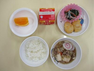 ・ごはん ・すき焼き風煮 ・春雨サラダ ・チキンナゲット ・オレンジ ・牛乳