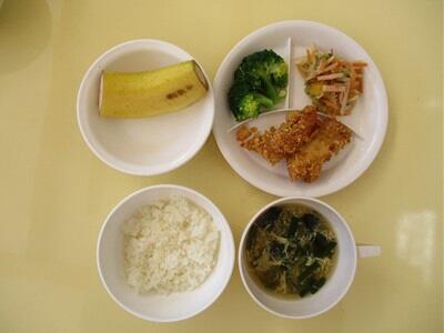 ・ごはん ・鶏肉のコーンフレーク焼き ・彩り和え ・ブロッコリー ・バナナ ・かき玉汁