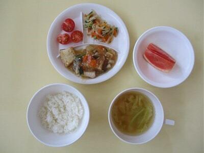 ・ごはん ・鶏肉と厚揚げのおろし炒め ・ミニトマト ・ごま和え ・グレープフルーツ ・みそ汁