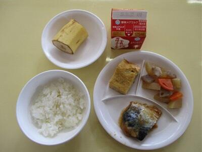・ごはん ・鯖の味噌煮 ・卵焼き ・筑前煮 ・バナナ ・牛乳