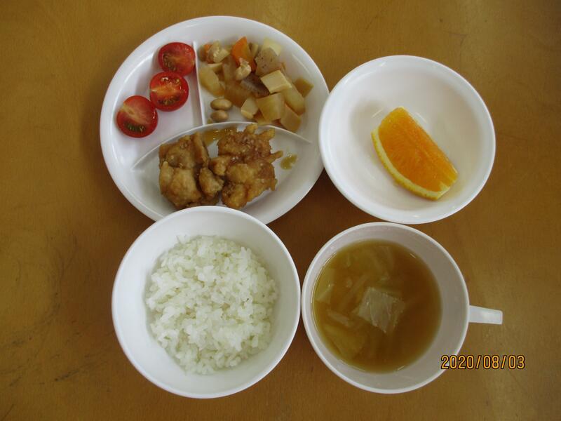 ・ごはん ・鶏肉のかりん揚げ ・五目豆 ・オレンジ ・ミニトマト ・味噌汁