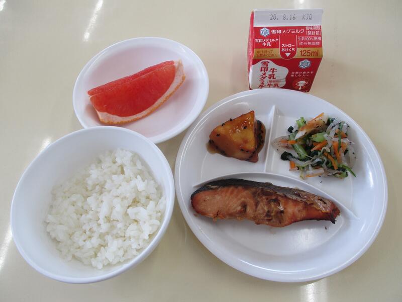 ・ごはん ・鮭の香味焼き ・ゆかり和え ・大学芋 ・グレープフルーツ ・牛乳