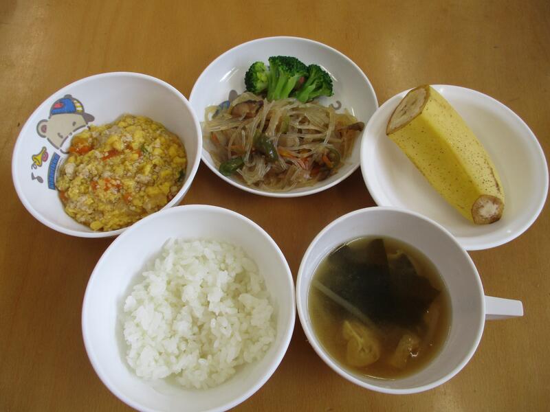 ・ごはん ・三色そぼろ ・春雨の金平 ・ブロッコリー ・バナナ ・味噌汁