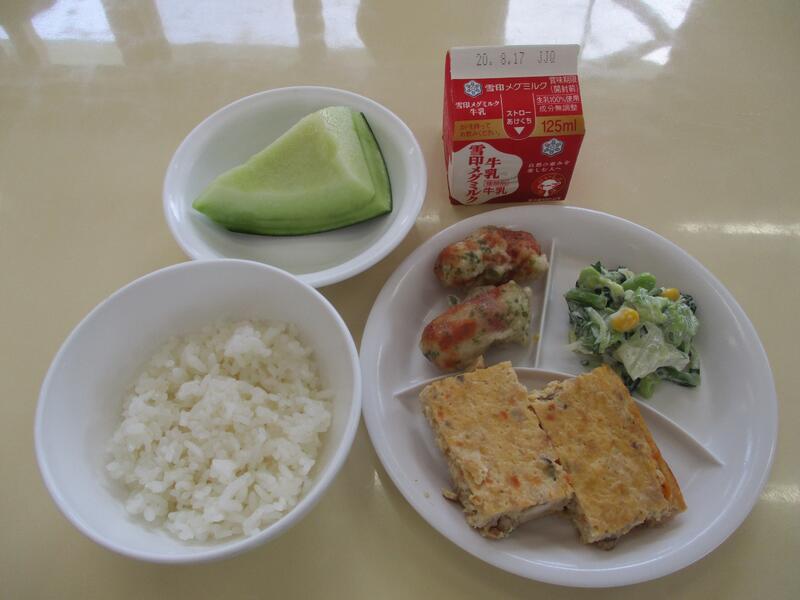 ・ごはん ・ぎせい豆腐 ・ちくわの磯辺揚げ ・グリーンサラダ ・メロン ・牛乳