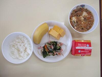 ・ごはん ・麻婆豆腐 ・厚焼き玉子 ・五色和え ・バナナ ・牛乳