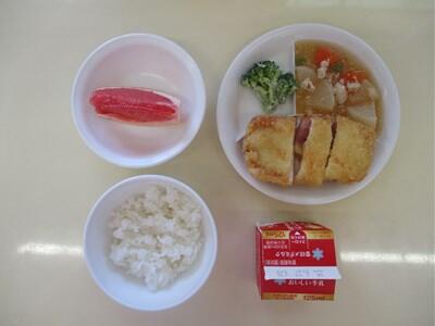 ・ごはん ・はんぺんチーズフライ ・大根のそぼろ煮 ・ブロッコリー ・グレープフルーツ ・牛乳