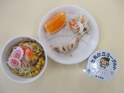 ・醤油ラーメン ・蒸し餃子 ・マリネサラダ ・ヨーグルト ・オレンジ