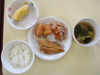 ・ごはん ・ホキの甘みそ焼き ・五目豆 ・チキンナゲット ・バナナ ・みそ汁