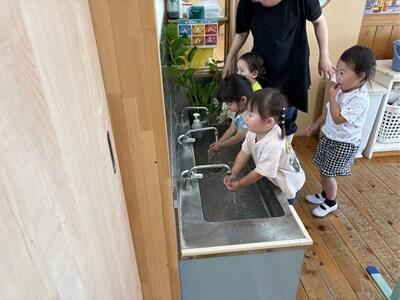 なんでも自分でやってみたい時期のりんご組さん、昼食の前の手洗いも上手でしょ?!