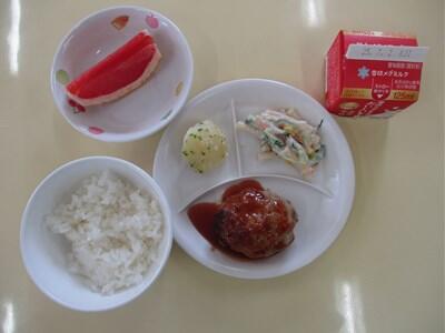 ・ごはん ・ハンバーグ ・マカロニサラダ ・粉ふきいも ・グレープフルーツ ・牛乳
