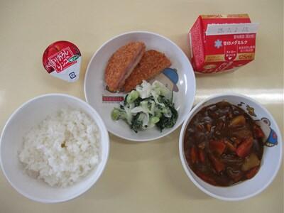 ・ごはん ・チキンカレー ・ハムカツ ・グリーンサラダ ・ミニゼリー ・牛乳