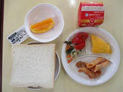 ・チョコパン(乳児組はいちごパンに変更)・ペンネミート ・ツナマヨオムレツ ・海藻サラダ ・ミニトマト ・オレンジ ・牛乳