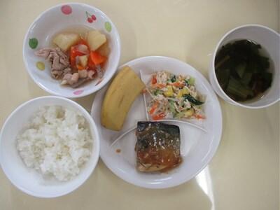 ・ごはん ・鯖のみそ煮 ・肉じゃが ・バンバンジーサラダ ・バナナ ・野菜スープ