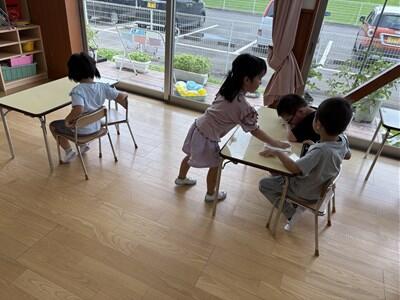 きりん組さんは当番があるらしく、お当番さんが、テーブルを拭いてくれるんですって
