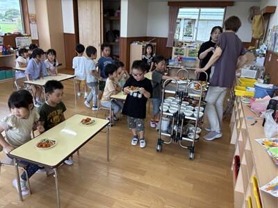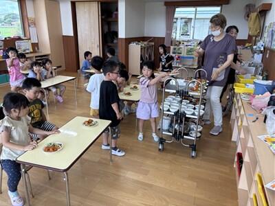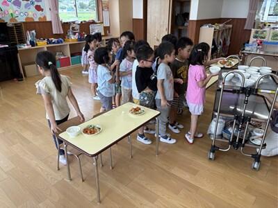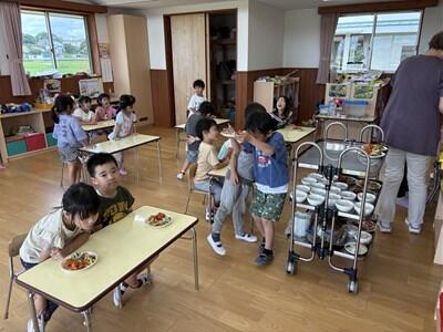 いつもよりちょっと早く見に行ったら、給食の準備中でした