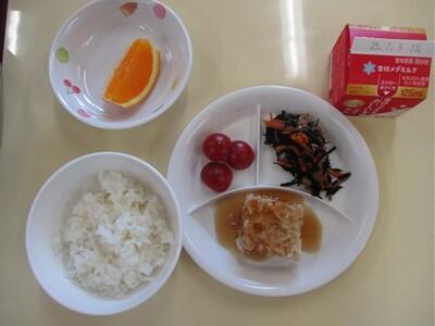 ・ごはん ・鶏つくね ・ひじきの煮物 ・ミニトマト ・オレンジ ・牛乳