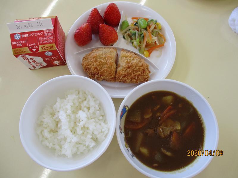 ・ごはん ・ポークカレー ・和風サラダ ・エビカツ ・いちご ・牛乳
