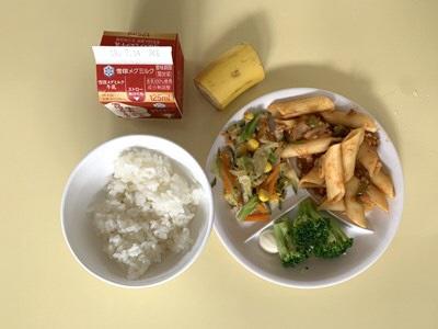 ・ごはん ・ペンネミート ・ブロッコリー ・コーンサラダ ・バナナ ・牛乳