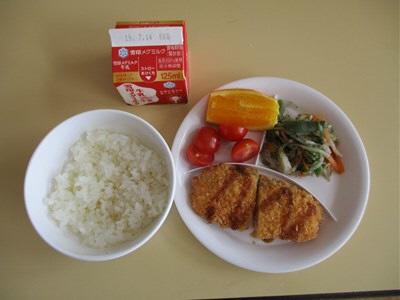・ごはん ・鮭フライ ・ごま和え ・ミニトマト ・オレンジ ・牛乳