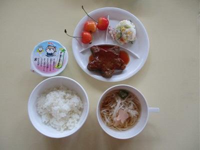 ・ごはん ・星型ハンバーグ ・ポテトサラダ ・そうめん汁 ・さくらんぼ ・七夕ゼリー