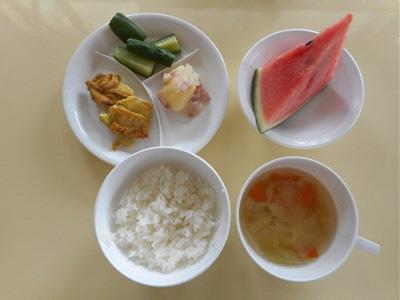 ・ごはん ・タンドリーチキン ・スティックきゅうり ・ジャーマンポテト ・すいか ・スープ