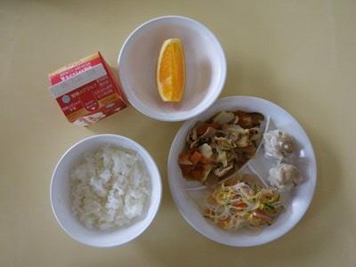 ・ごはん ・回鍋肉 ・焼売 ・バンサンスー ・オレンジ ・牛乳