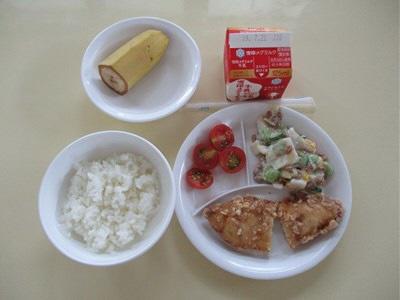 ・ごはん ・モロの竜田揚げ ・納豆サラダ ・ミニトマト ・バナナ ・牛乳