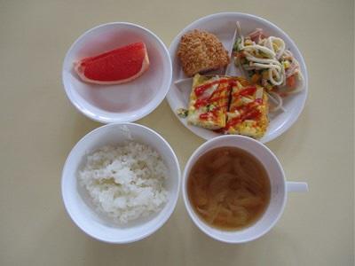 ・ごはん ・スパニッシュオムレツ ・えびかつ ・スパサラダ ・みそ汁 グレープフルーツ