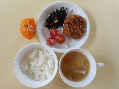 ・ごはん ・チキンミンチカツ ・ひじきの煮物 ・豚汁 ・ミニトマト ・冷凍みかん