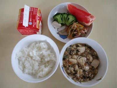 ご飯 マーボー豆腐 ブロッコリー 彩り和え グレープフルーツ 牛乳