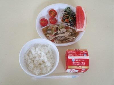 ・ごはん ・豚肉の生姜炒め ・ミニトマト ・磯辺和え ・グレープフルーツ ・牛乳