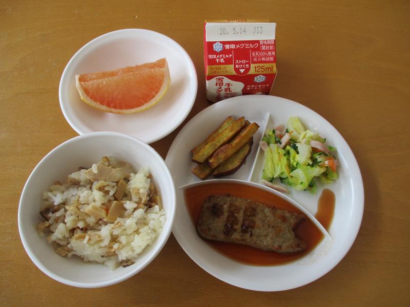 ・筍ごはん ・こいのぼりハンバーグ ・おさつフライ ・春キャベツの中華風サラダ ・牛乳
