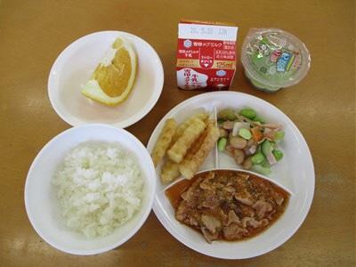 ・ごはん ・ポークチャップ ・フレンチポテト ・ビーンズサラダ ・甘夏 ・牛乳 ・こどもの日ぜりー