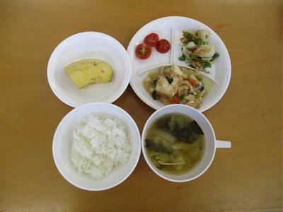 ・ごはん ・鶏肉と厚揚げのおろし炒め ・ミニトマト ・ごま和え ・バナナ ・みそ汁