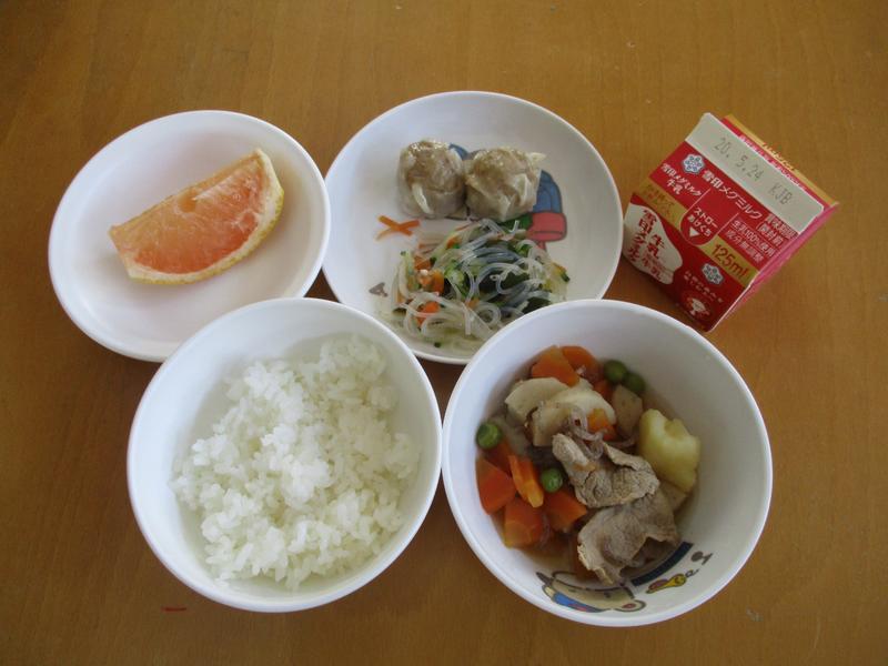 ・ごはん ・肉じゃが ・焼売 ・春雨の酢の物 ・グレープフルーツ ・牛乳