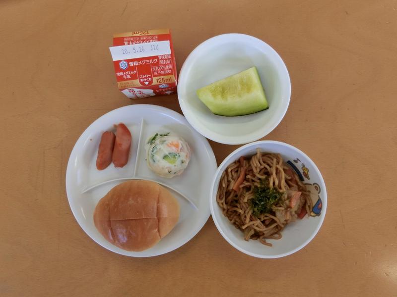 ・バターロール ・焼きそば ・ウインナー ・ポテトサラダ ・メロン ・牛乳
