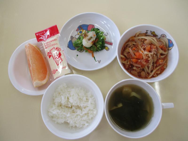 ・ごはん ・チリコンカン ・おかか和え ・みそ汁 ・チーズ ・グレープフルーツ