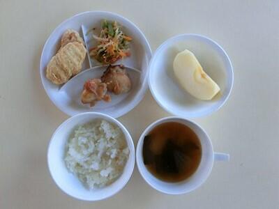・ごはん ・鶏肉のママレード焼き ・豆腐ナゲット ・ごま和え ・りんご ・味噌汁