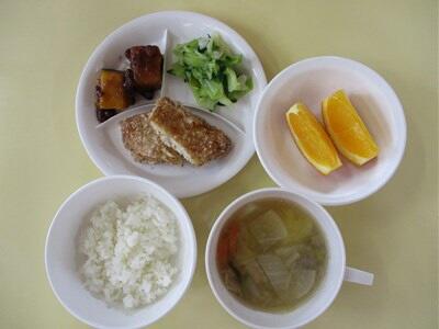 ・ごはん ・モロの竜田揚げ ・かぼちゃのいとこ煮 ・即席漬け ・オレンジ ・豚汁