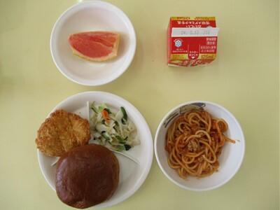 ・黒糖パン ・ミートスパゲッティ ・ちくわサラダ ・えびかつ ・グレープフルーツ ・牛乳