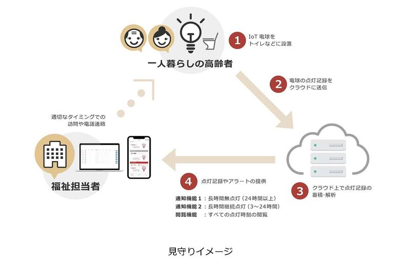 「みまもり電球」は、家の玄関やトイレなどに通常の電球と同じように取り付けるだけで、電球の点灯記録を、福祉担当職員のスマートフォンなどに通知することができます。一人暮らしの高齢者の生活に異変がないかどうかを、プライバシーに配慮しつつ、簡単、安価に把握できるほか、複数の高齢者の状況を一元的にチェックすることができるため、地域コミュニティの安心安全な暮らしの維持に活用いただくことが可能です。