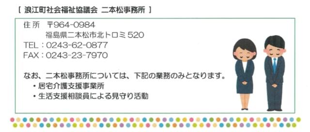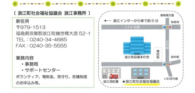 浪江町社会福祉協議会:0240-34-4685(担当:尾崎)平日8:30~17:15繋がります。