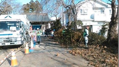 まずは、チェンソーを使えるボランティアさんが中心の8名によるグループの活動現場。ご自宅の庭木伐採依頼現場です。・・・・が、