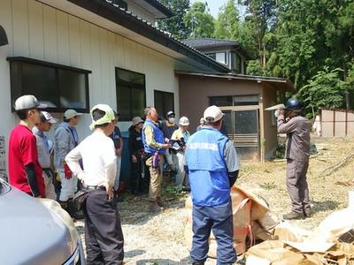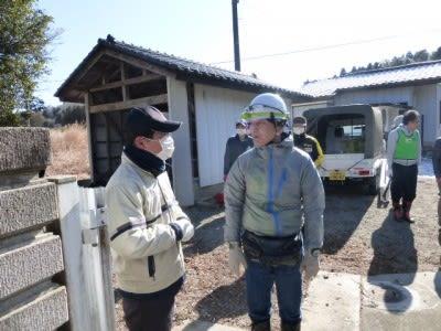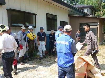 まずは、依頼主さんの挨拶と、活動希望の説明を。高齢となり、梅の木の管理が出来なくなり、近隣に帰還された住民さんの迷惑にならないようにとのことで、高さが2~3mの木を中心に伐採と集積活動です。