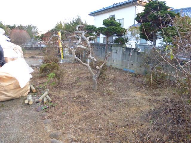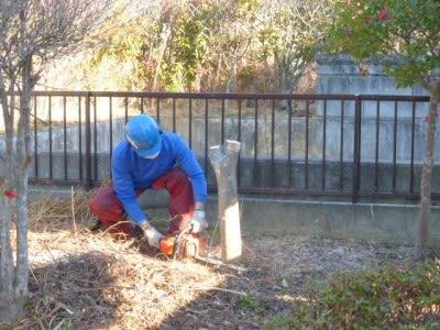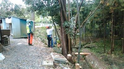 2か所目は依頼者の方が所有する倉庫敷地内の樹木の剪定と伐採で、この現場は山部の皆さんに担当してもらいました。