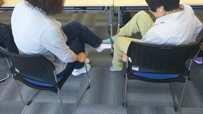 はじめに皆さんの緊張をほぐして、仲良くなっていただこうということで、手や足で輪っかを渡すゲームを行い