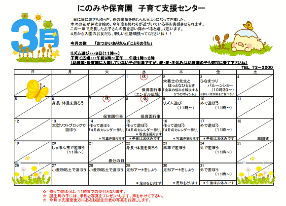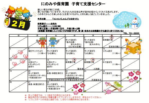 2月12日(月)に「おひなさま製作」の活動が入っていますが、建国記念日の振替休日のため、